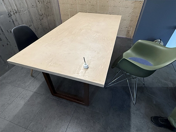 打ち合わせ室用のテーブルを、モールテックスで仕上げた一枚天板を制作しました。無機質な質感とマットな表情が特徴で、空間に自然と溶け込みながらも存在感を放つ仕上がりです。