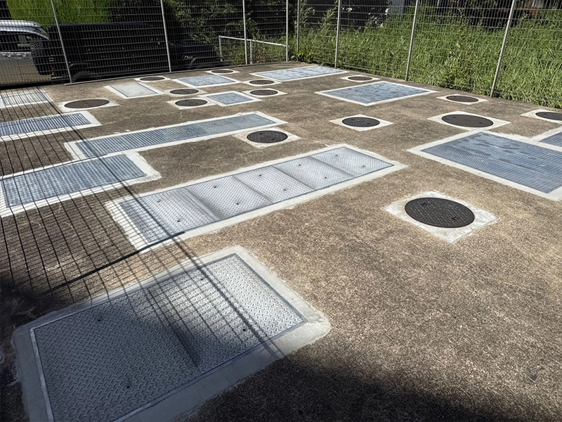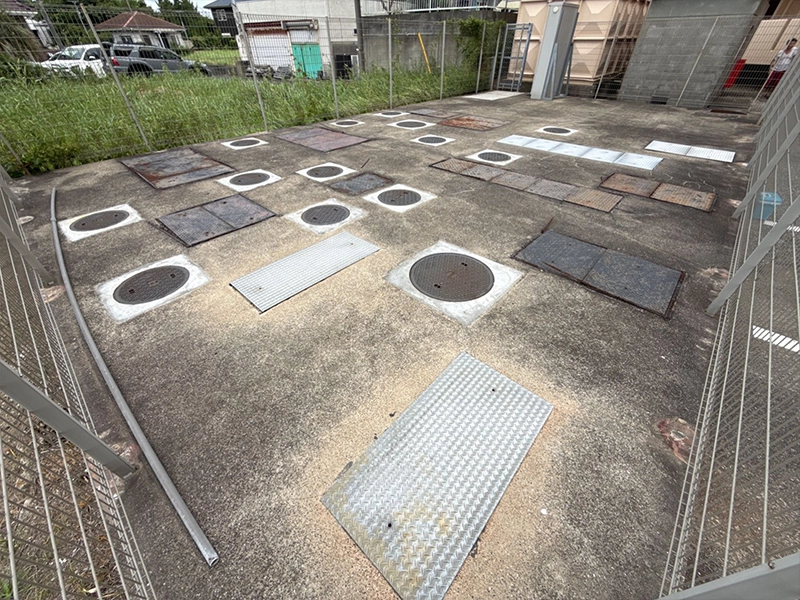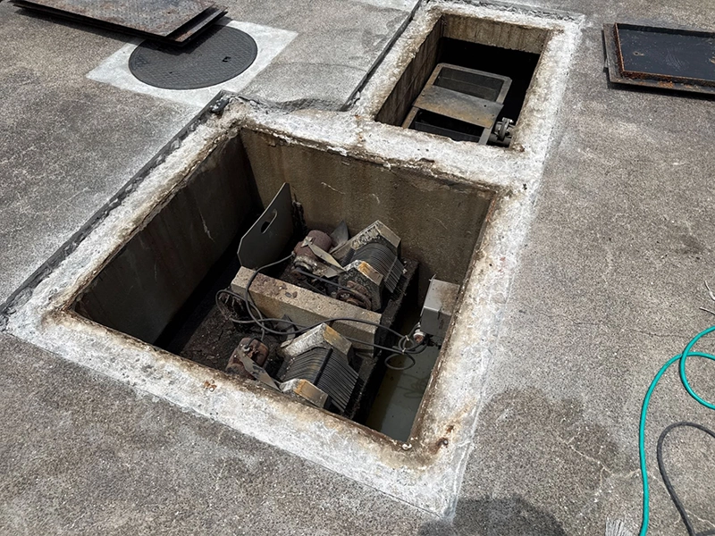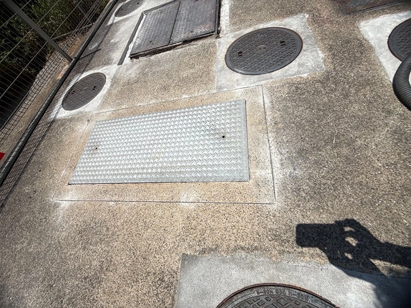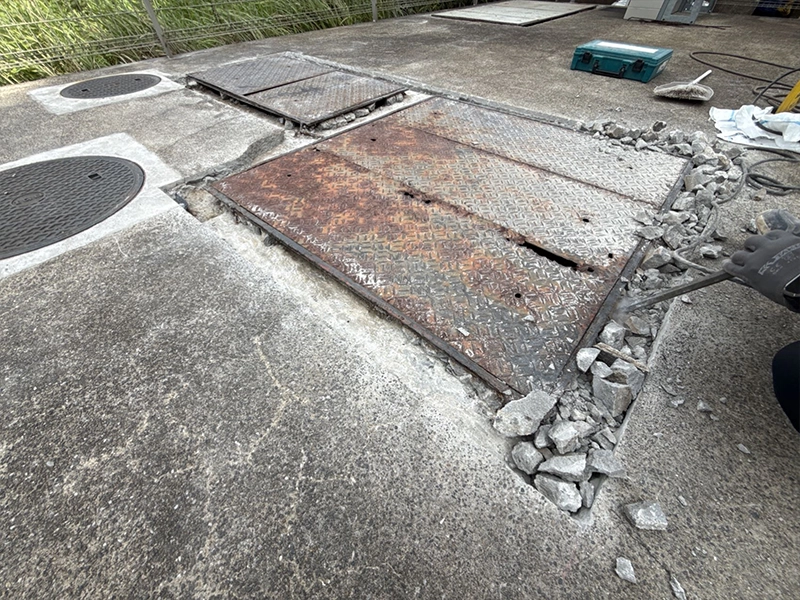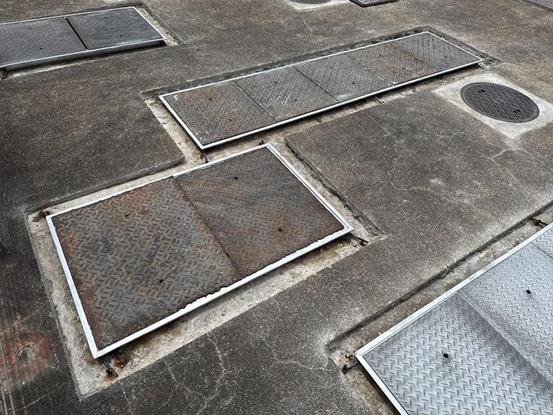 既存の縞鋼板の蓋とLアングルは長年の使用により錆が進行し、強度が著しく低下していました。蓋の一部には腐食による穴が開き、歩行者や作業員の転倒・落下などの危険がある状態でした。